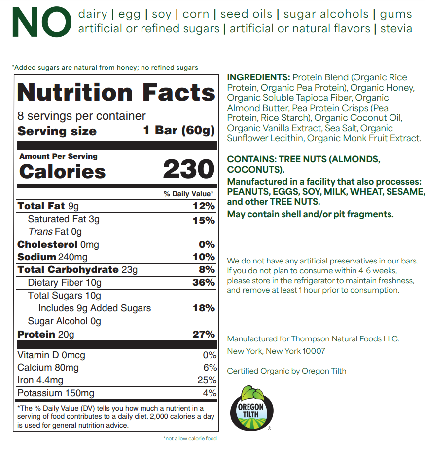 Almond Vanilla: Protein Blend (Organic Rice Protein, Organic Pea Protein, Organic Almond Protein), Organic Honey, Organic Soluble Tapioca Fiber, Organic Almond Butter, Pea Protein Crisps (Pea Protein, Rice Starch), Organic Coconut Oil, Organic Vanilla Extract, Sea Salt, Organic Sunflower Lecithin, Organic Monk Fruit Extract.
