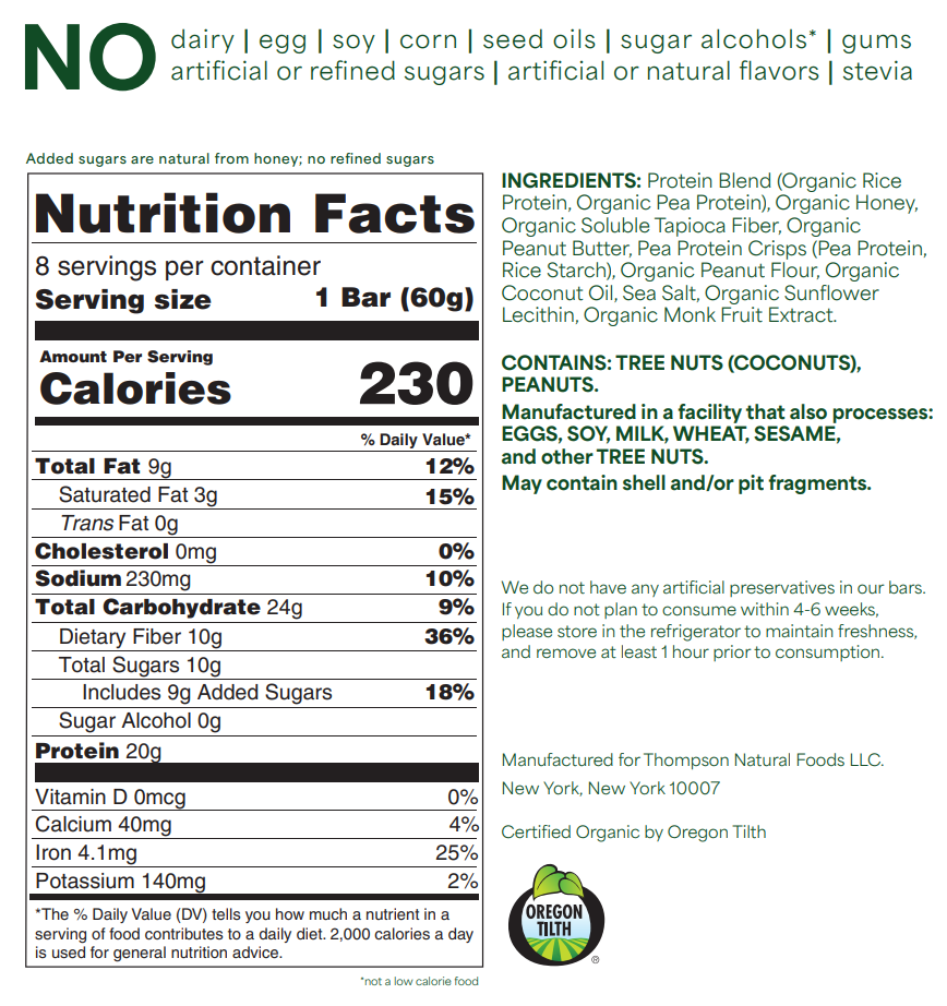 Protein Blend (Organic Rice Protein, Organic Pea Protein), Organic Honey, Organic Soluble Tapioca Fiber, Organic Peanut Butter, Pea Protein Crisps (Pea Protein, Rice Starch), Organic Coconut Oil, Sea Salt, Organic Sunflower Lecithin, Organic Monk Fruit Extract.